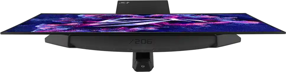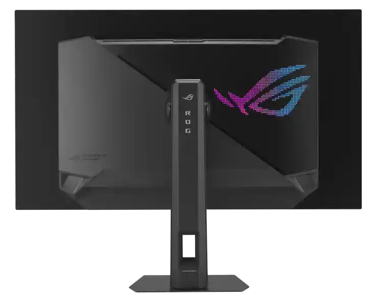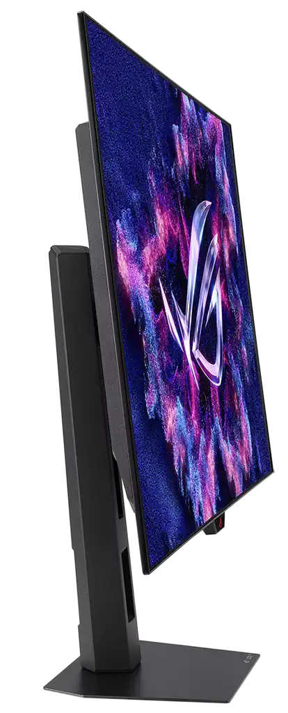 Puoi farlo respirare, lampeggiare o sincronizzarlo con l’azione sullo schermo. Una piccola rivoluzione c’è anche nel piedistallo. ASUS ha abbandonato le zampe di ragno del modello PG32UCDM, sostituendole con una piastra piatta, compatta e robusta in metallo. Con questa nuova base puoi facilmente far scivolare un tappetino da gaming sotto il monitor. Quindi, più spazio libero sulla scrivania per tastiera, mouse e altri accessori. Un look più pulito, più moderno e meno ingombrante.