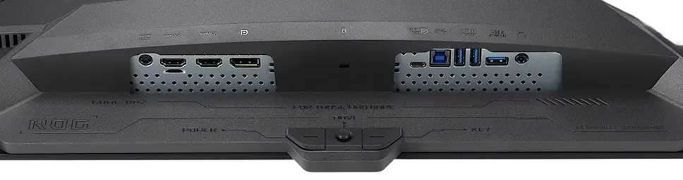 L’ASUS ROG Strix XG32UCWMG non delude quando si tratta di porte. La scelta è ampia e ben pensata, anche se manca il DisplayPort 2.1. Sul lato inferiore del monitor, trovi un DisplayPort 1.4 con supporto a Display Stream Compression (DSC); essenziale per gestire il flusso dati di 4K a 240Hz.