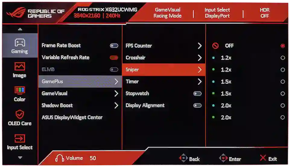 La funzione più interessante è Frame Rate Boost. Con un solo click sul pulsante dedicato e un secondo click sul joystick, puoi passare istantaneamente dalla modalità 4K/240Hz a 1080p/480Hz, e viceversa. Il menu GameVisual offre nove preset di immagine, tra cui “Racing”, che è già perfetto di fabbrica, e “Gaming HDR”, ottimizzato per la massima dinamica. Il menu GamePlus è un arsenale per i giocatori: include mirini personalizzabili, modalità “sniper” per lo zoom, timer, contatori di frame e linee di allineamento.