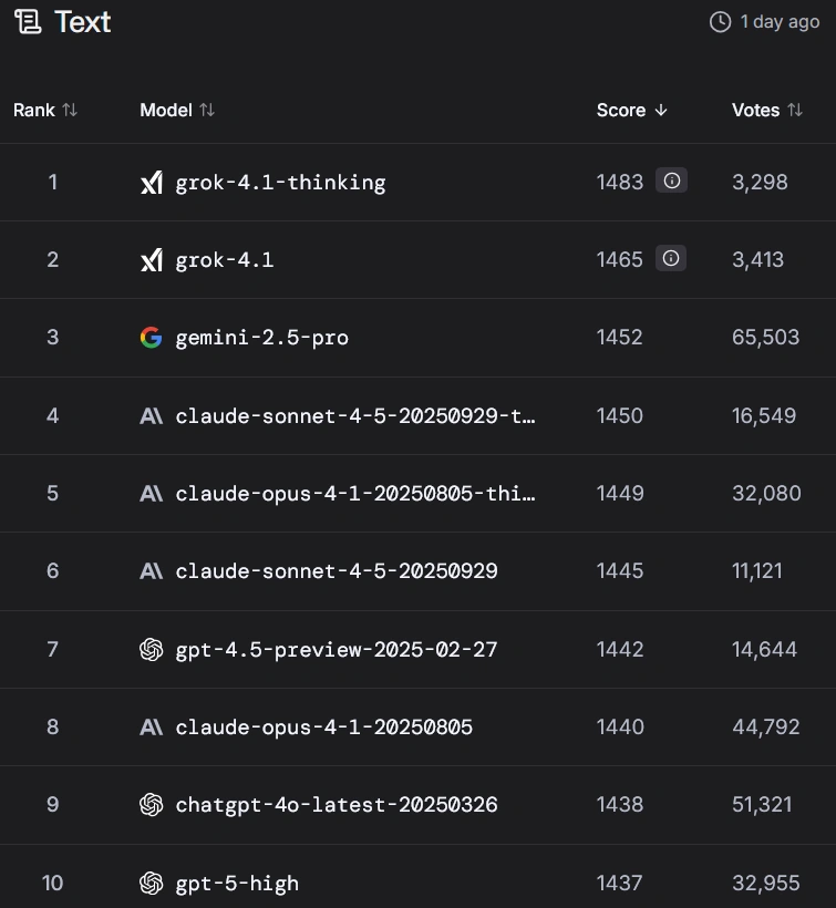 Sul fronte delle prestazioni comparative, Grok 4.1 Thinking ha conquistato la vetta della LMArena Text Leaderboard con un punteggio Elo di 1483; supera di 31 punti il modello gemini-2.5-pro. Anche la versione non-thinking si posiziona al secondo posto con 1465 punti Elo; supera tutte le configurazioni di ragionamento degli altri modelli presenti nella classifica pubblica. Si tratta di un balzo notevole rispetto a Grok 4, che occupava la trentatreesima posizione. Da notare che invece gpt-5.1, nato per correggere gli errori del lancio di GPT-5, non compare neanche tra le prime 10 posizioni.