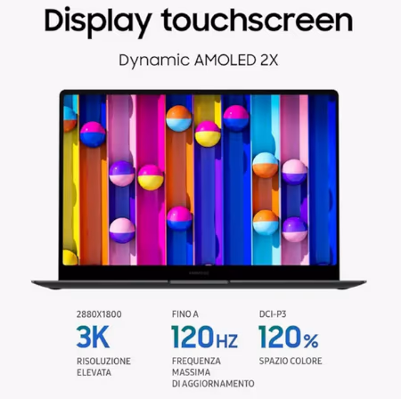 | Display | Dynamic AMOLED 2X, 3K (2880×1800), 16:10, 120Hz adattivo, touch, anti-riflesso, DisplayHDR 500, 120% DCI-P3 |