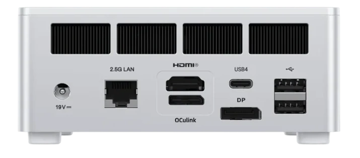 Sul retro, invece si trovano l’uscita HDMI 2.1, la porta DisplayPort 1.4, il connettore OCuLink (attivabile tramite adattatore M.2), la presa Ethernet 2,5 Gbps e la porta USB4 Type-C a 40 Gbps. Quest’ultima è particolarmente versatile; oltre a trasferire dati a velocità elevate, supporta la Power Delivery bidirezionale (65–100W in ingresso, 15W in uscita) e l’uscita video tramite DisplayPort Alt Mode. Infine sulla destra ci sono 2 USB 2.0 per le periferiche (mouse, tastiera, ecc).