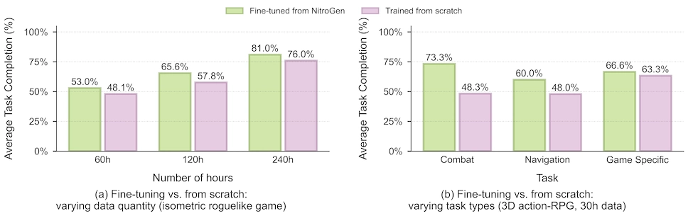 Dopo il pre-training completo NitroGen raggiunge tassi di completamento dei task sorprendentemente alti in valutazione zero-shot; cioè senza ulteriore fine-tuning specifico per gioco. Le percentuali medie variano dal 45% al 60% su combat, navigazione e task specifici, sia in 2D che in 3D. Per verificare quanto il modello funzioni su giochi nuovi, il team esclude un titolo dall’addestramento iniziale; poi lo allena specificatamente su quel gioco usando sempre la stessa quantità di dati e risorse.